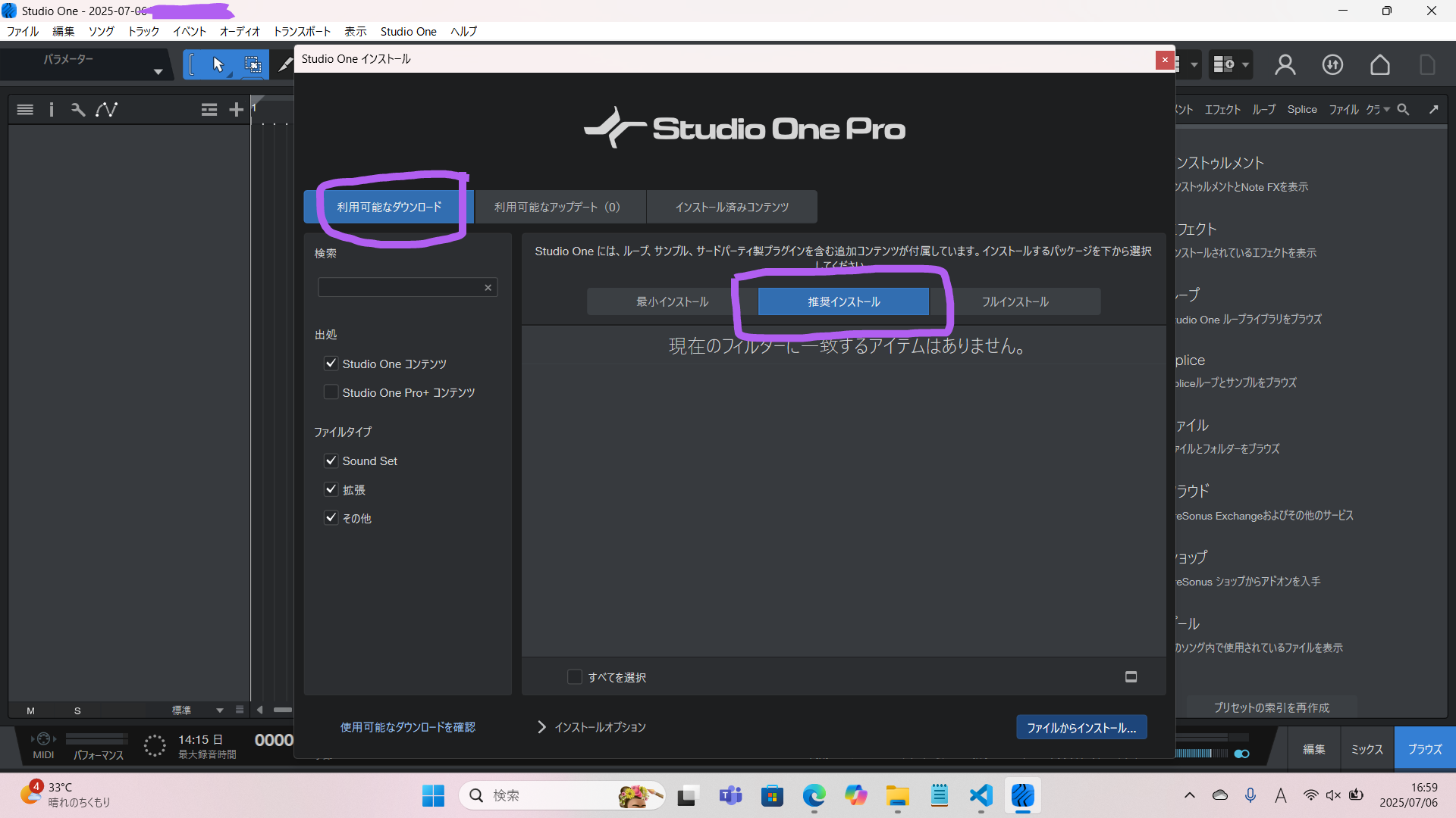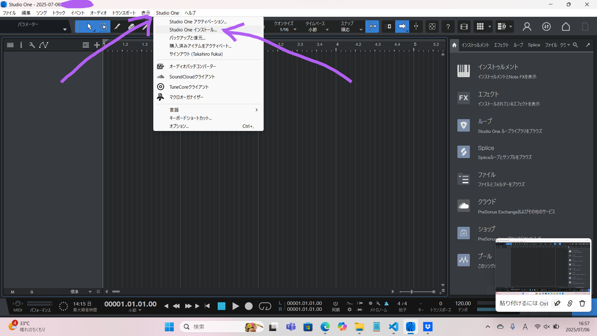 で、上部メニューを見てくれ。「Studio One」ってあるじゃん?それを次のようにクリックしていって「Studio One」→「Studio Oneインストール…」そしたら新しいウィンドウが立ち上がるから、ここから「利用可能なダウンロード」→「推奨インストール」を選んだら、推奨インストールがダウンロード、インストールできます。